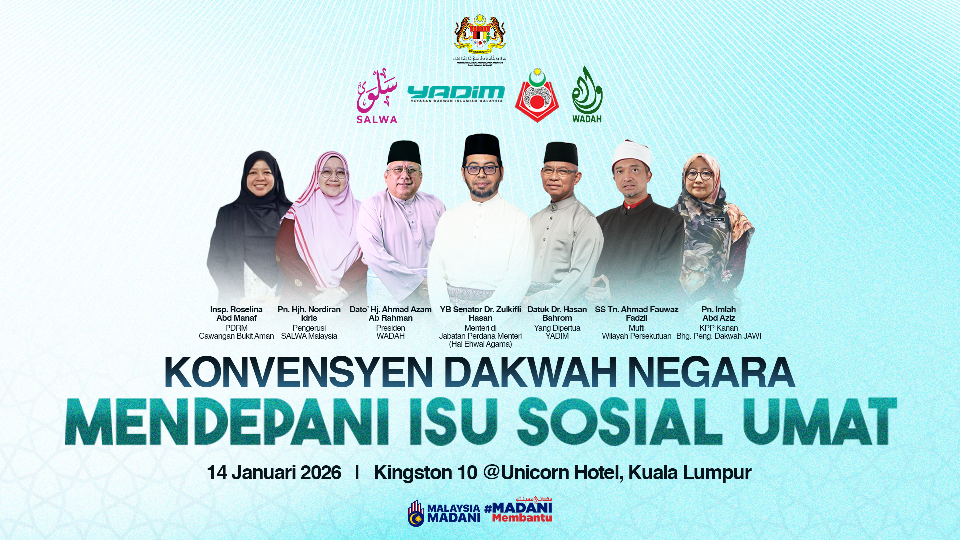 Kuala Lumpur, 14 Januari 2026 - Konvensyen Dakwah Negara: Mendepani Isu Sosial Umat telah berjaya dianjurkan pada 14 Januari 2026 (Rabu) bertempat di Kingston 10 @ Unicorn Hotel, Kuala Lumpur. Program berskala nasional ini dianjurkan oleh Pertubuhan SALWA Malaysia dengan kerjasama Yayasan Dakwah Islamiah Malaysia (YADIM) sebagai wadah perbincangan strategik dalam menangani pelbagai isu sosial umat Islam yang semakin mencabar dalam era globalisasi dan pendigitalan.
