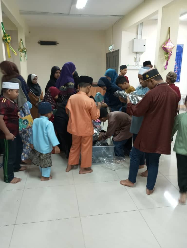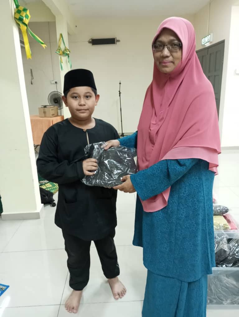 Penyerahan Iqra dan Al-Quran serta seluar dan baju baru kepada anak-anak Permata Al Quran SALWA di Flat Paroi oleh Ustazah Rahimi Shaari, Ketua Teras Pembangunan Komuniti SALWA.