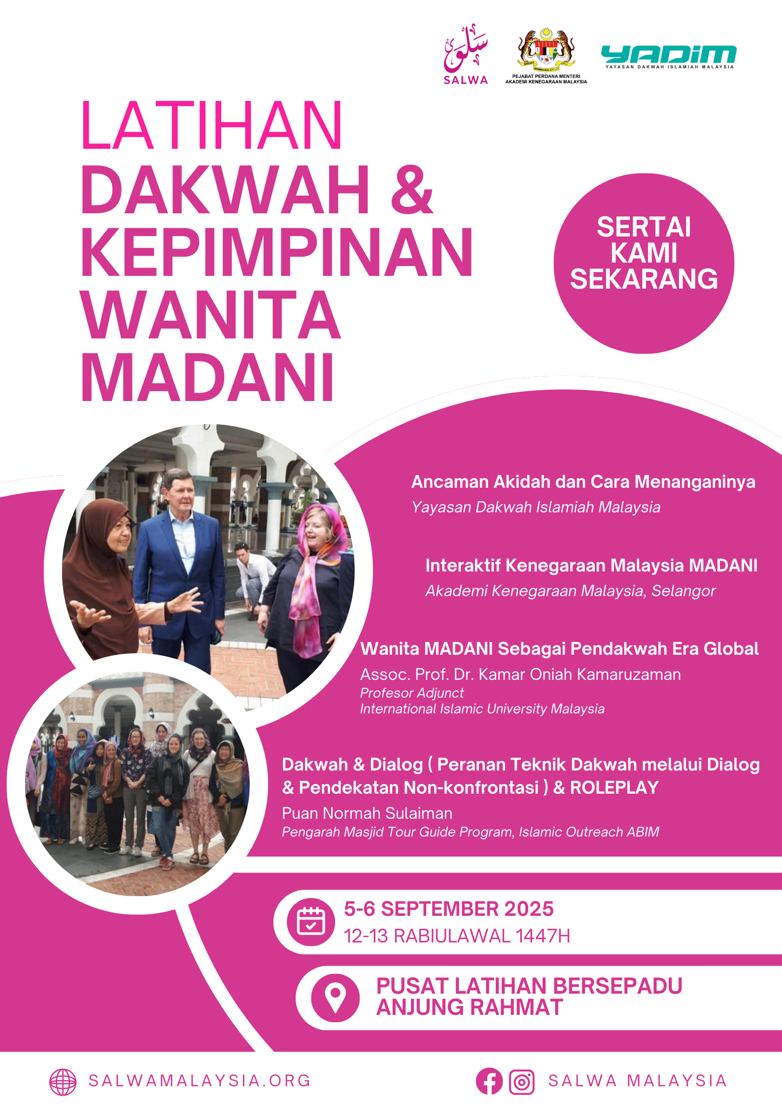 LATIHAN DAKWAH DAN KEPIMPINAN WANITA MADANI 📅 5 – 6 September 2025 (Jumaat–Sabtu)📍 Pusat Latihan Bersepadu Anjung Rahmat, Sg. Merab, Kajang Latihan dan Kepimpinan